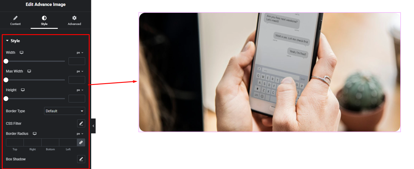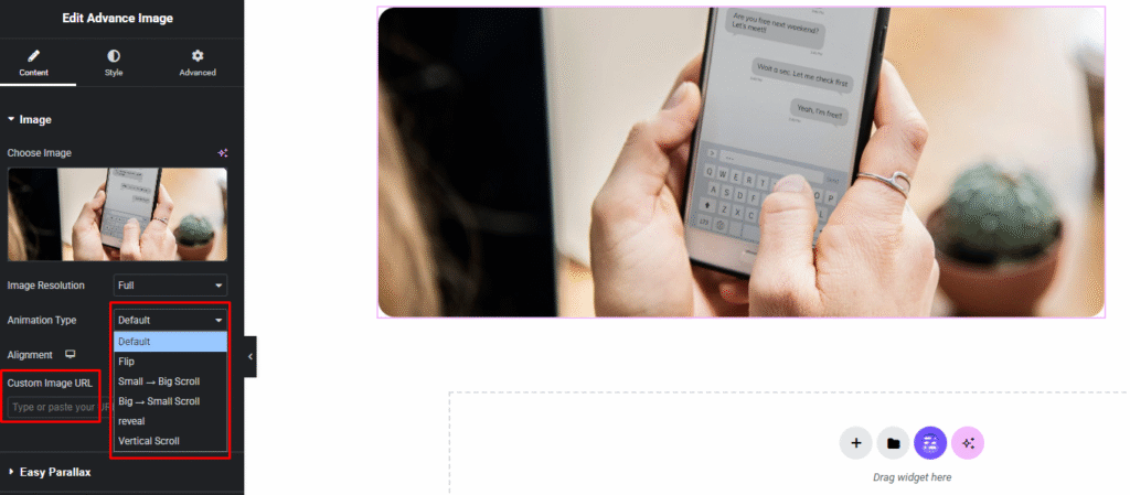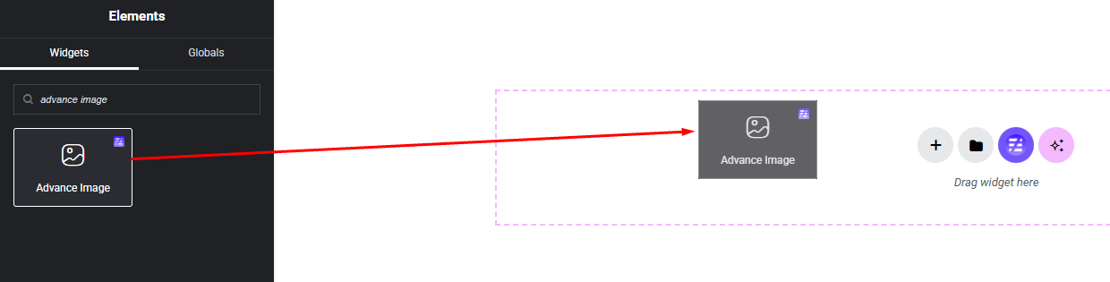 Select the Advance Image widget from the left panel, then drag and drop it into your desired area on the canvas.