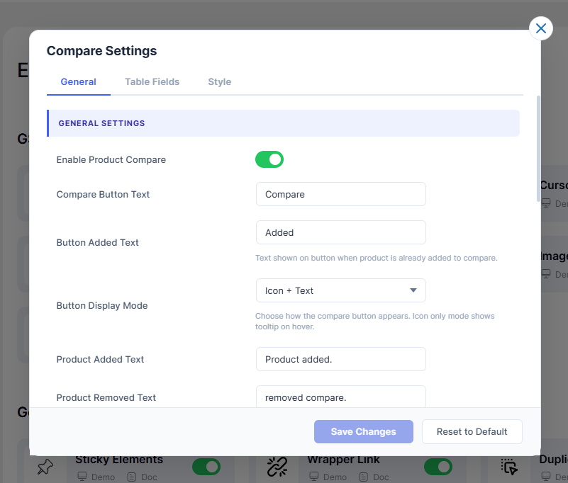 - 1.1 – Enable Product CompareToggles the entire Compare feature on or off sitewide.
