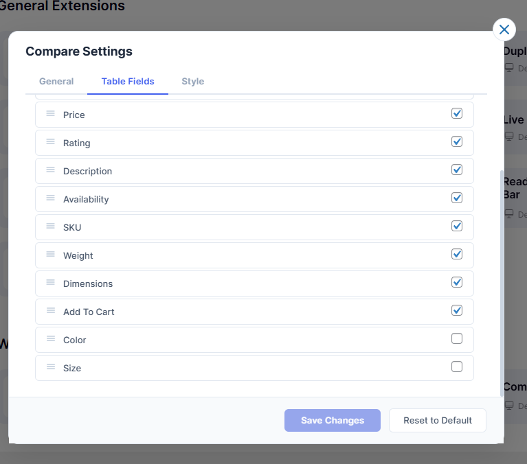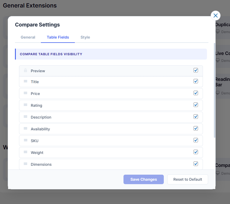 Compare feature has three tabs: General, Table Fields, and Style.