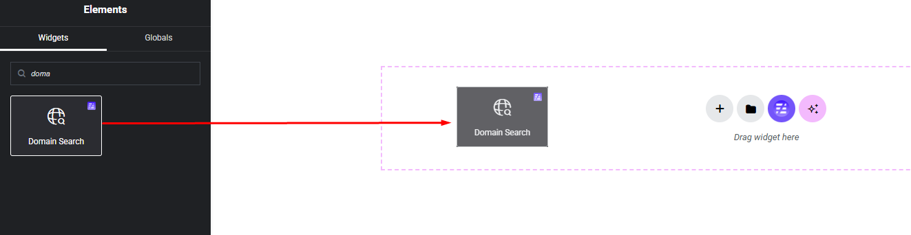 Select the Domain Search widget from the left panel, then drag and drop it into your desired area on the canvas.