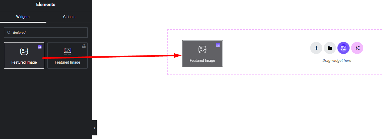 Select the Featured Image widget from the left panel, then drag and drop it into your desired area on the canvas.