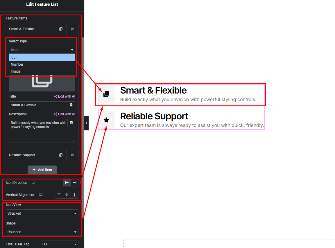 Easily customize your widgets appearance including Features List Items, Icon, Title & Description style —all from the Style panel.