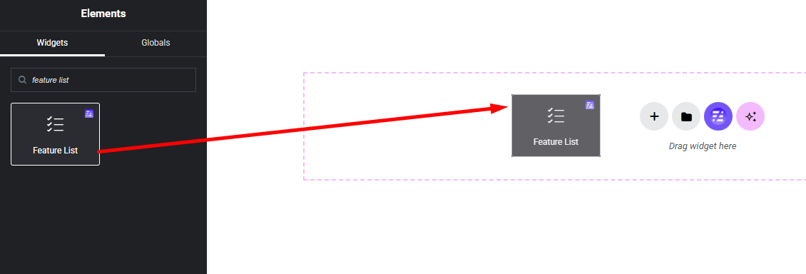Select the Features List widget from the left panel, then drag and drop it into your desired area on the canvas.