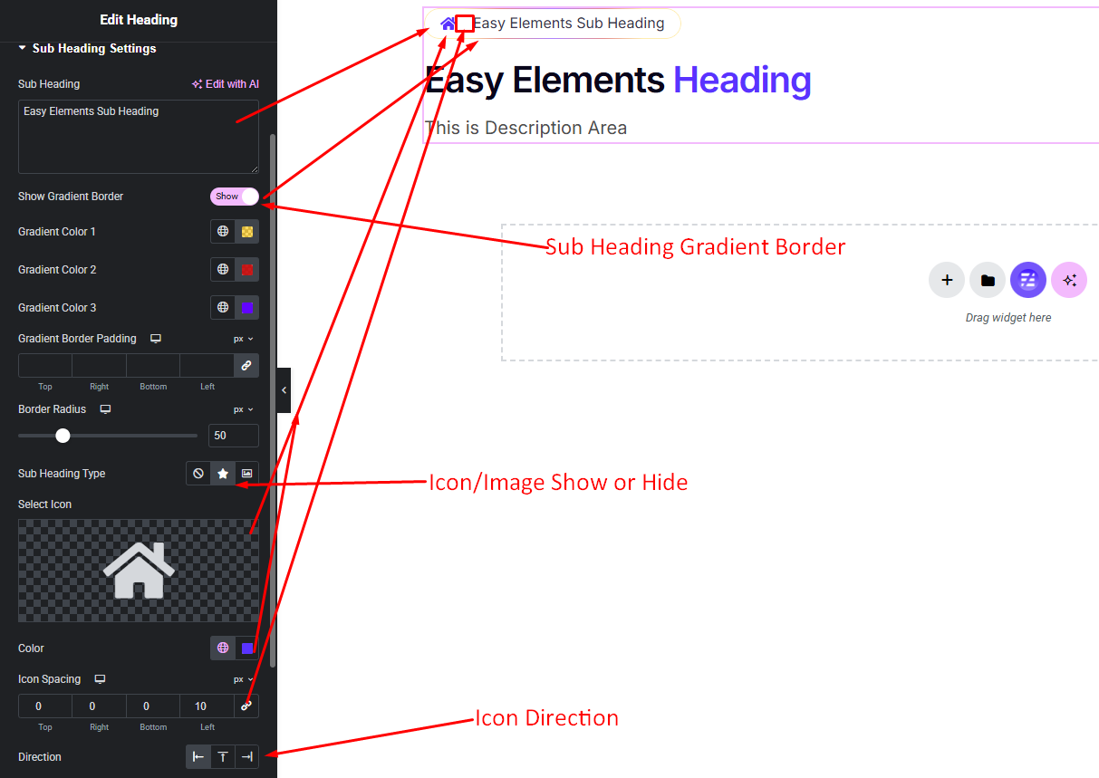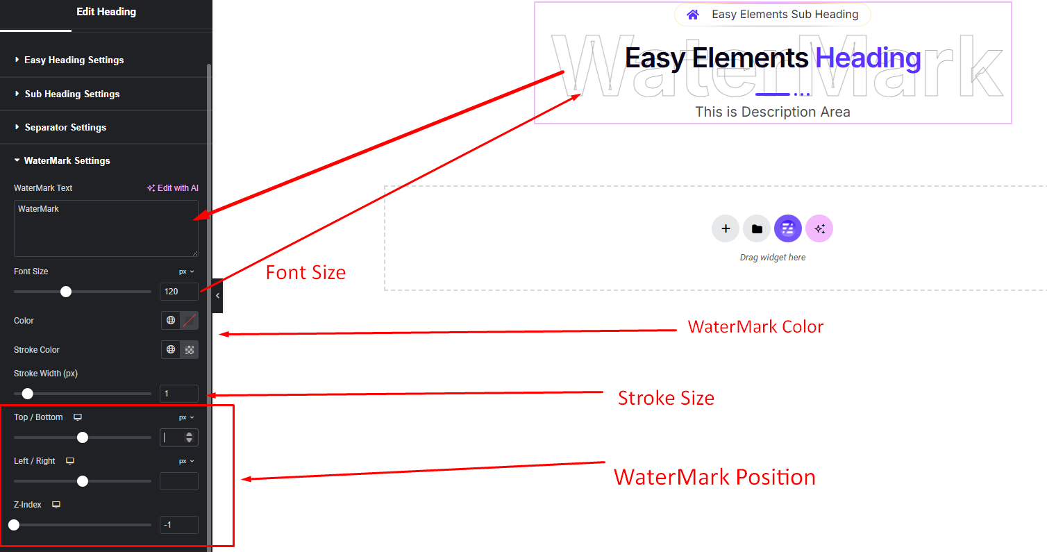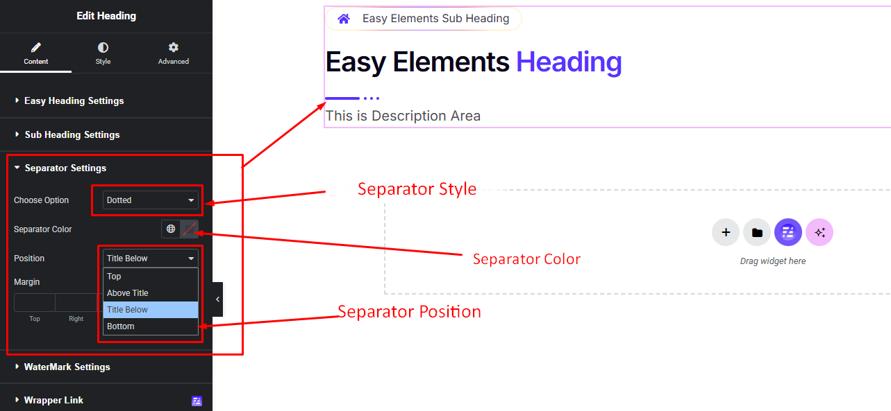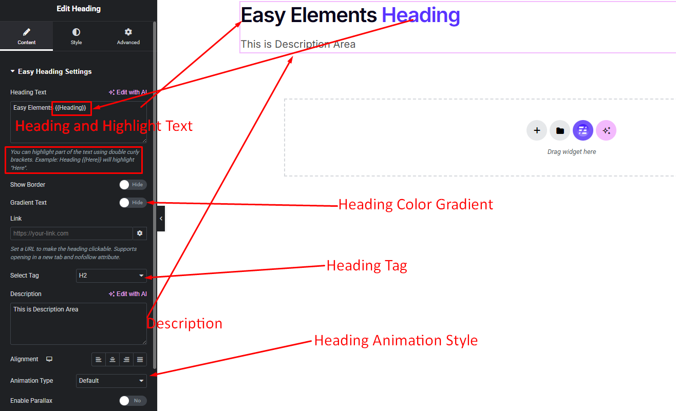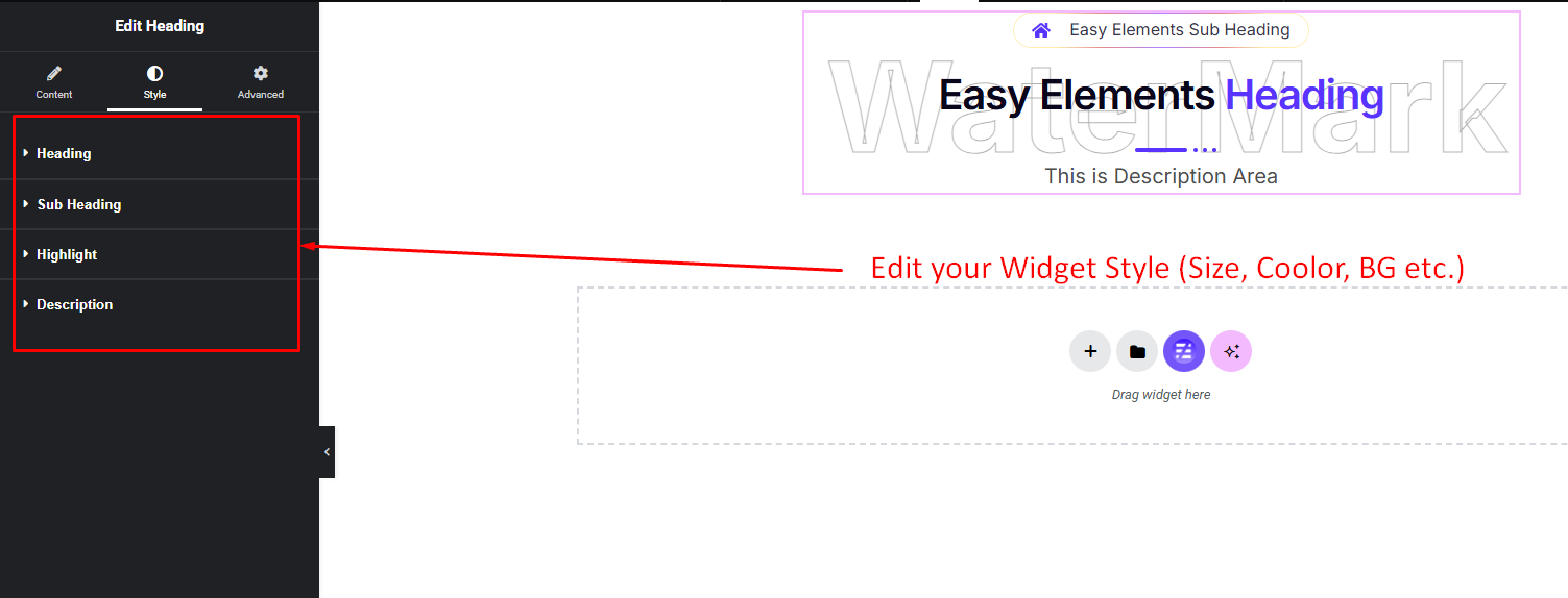 Select the Heading widget from the left panel, then drag and drop it into your desired area on the canvas.