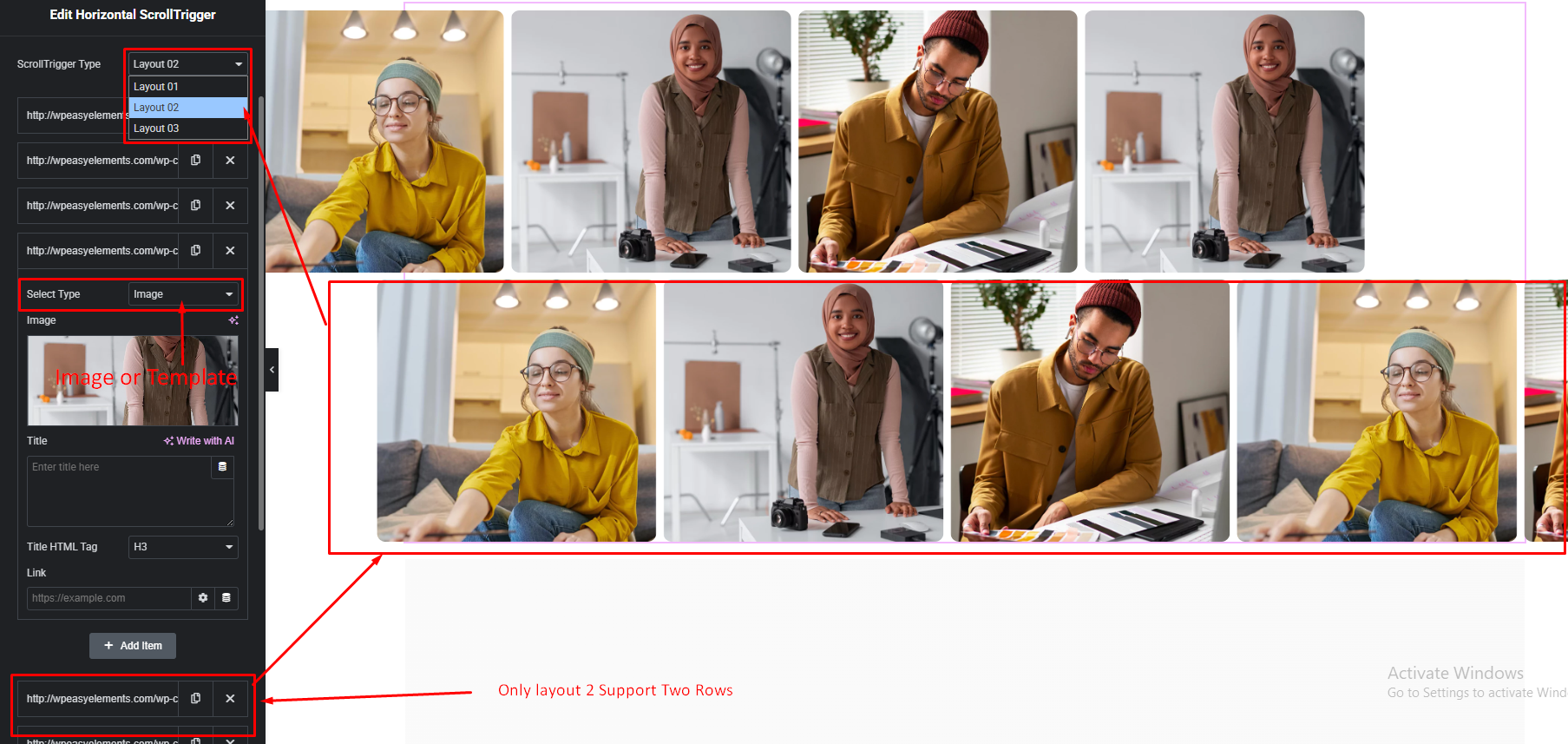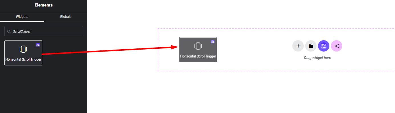 Select the Horizontal ScrollTrigger widget from the left panel, then drag and drop it into your desired area on the canvas.