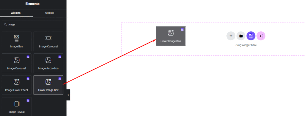 Select the Hover Image Box widget from the left panel, then drag and drop it into your desired area on the canvas.