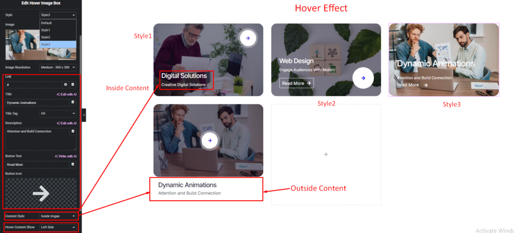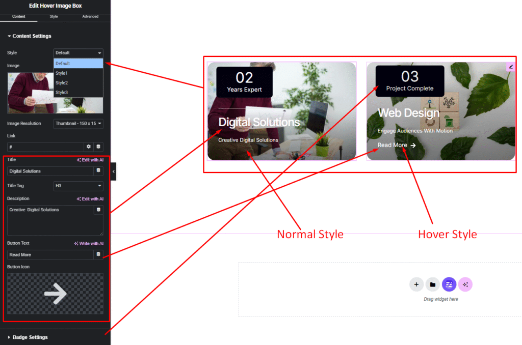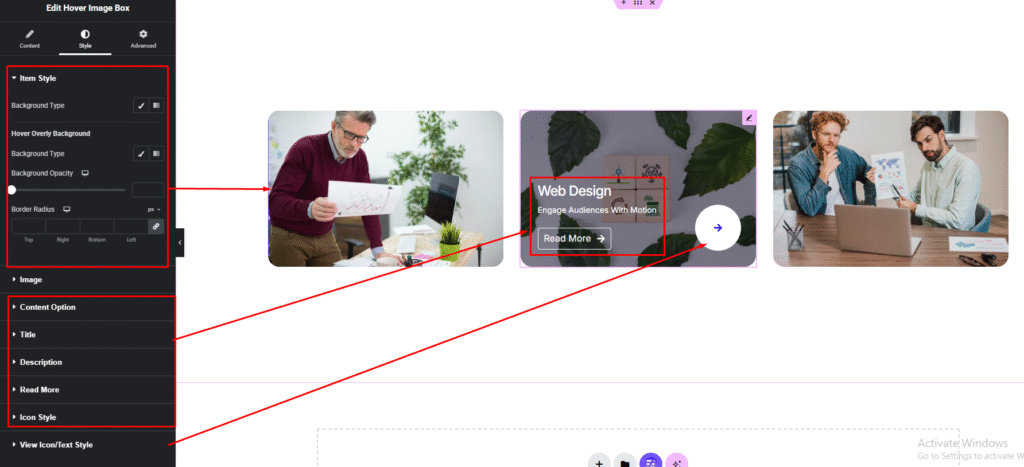Easily customize your widget’s appearance including Hover Image Box item, image, content option, title, description and more style — all from the Style panel.