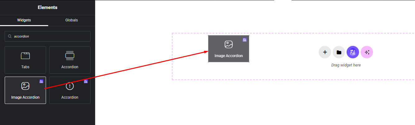 Select the Image Accordion widget from the left panel, then drag and drop it into your desired area on the canvas.