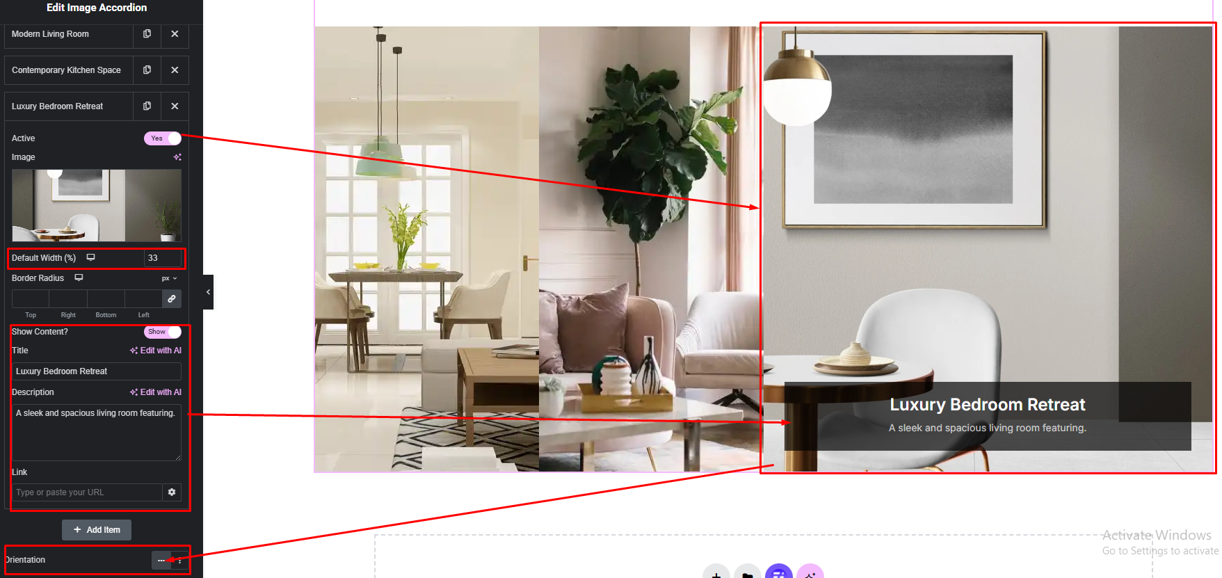 Easily customize your widget’s appearance including Image Accordion item, content part, title and description style — all from the Style panel.