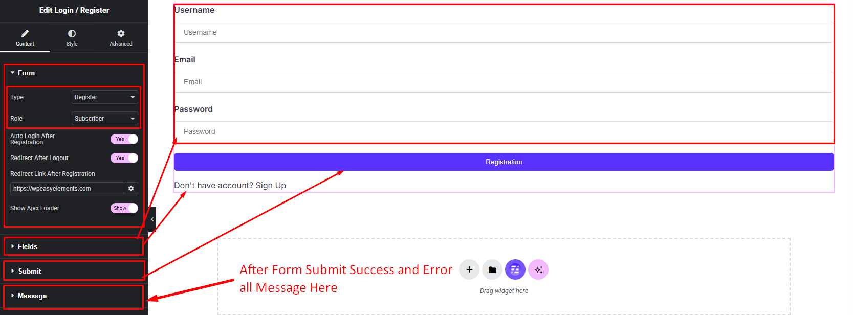 Message Settings: Success, Error & all others message show / hide and message text field.