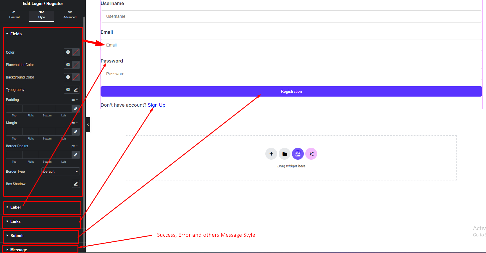 Easily customize your widgets appearance including input field, input label, text links, submit button & message style — all from the Style panel.