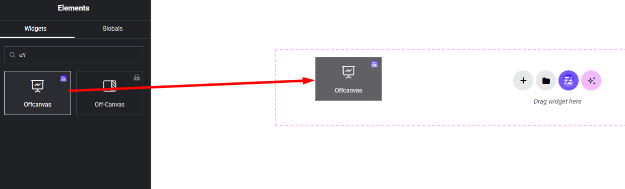 Select the Offcanvas widget from the left panel, then drag and drop it into your desired area on the canvas.