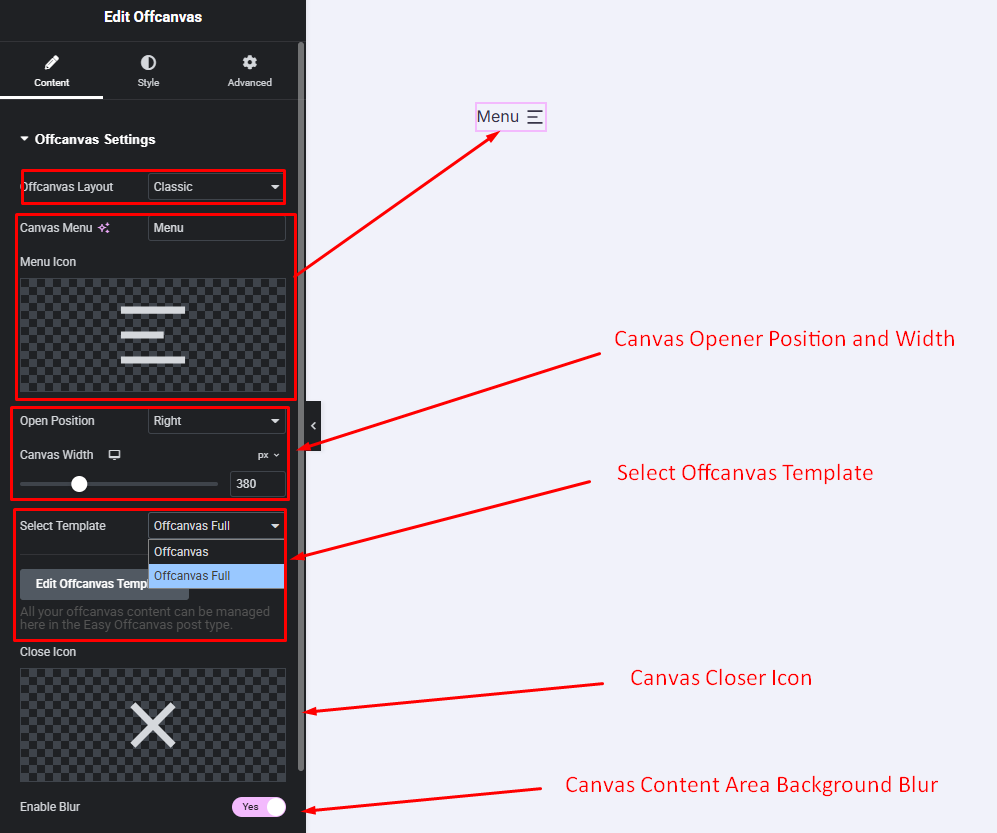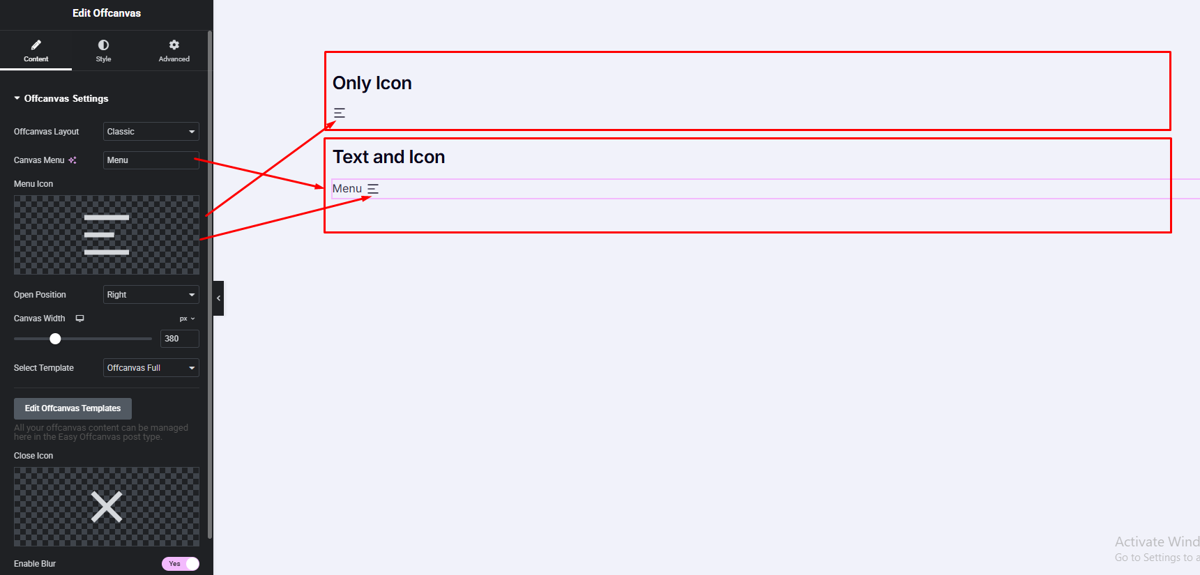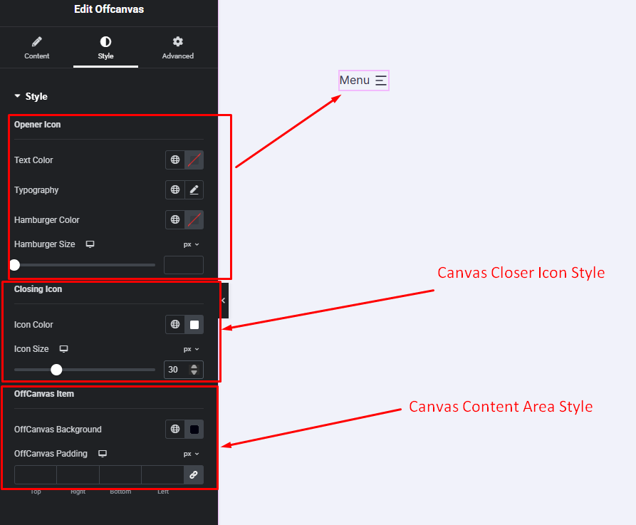 Easily customize your widgets appearance including Canvas content area style, Canvas opener & closer icon style —all from the Style panel.