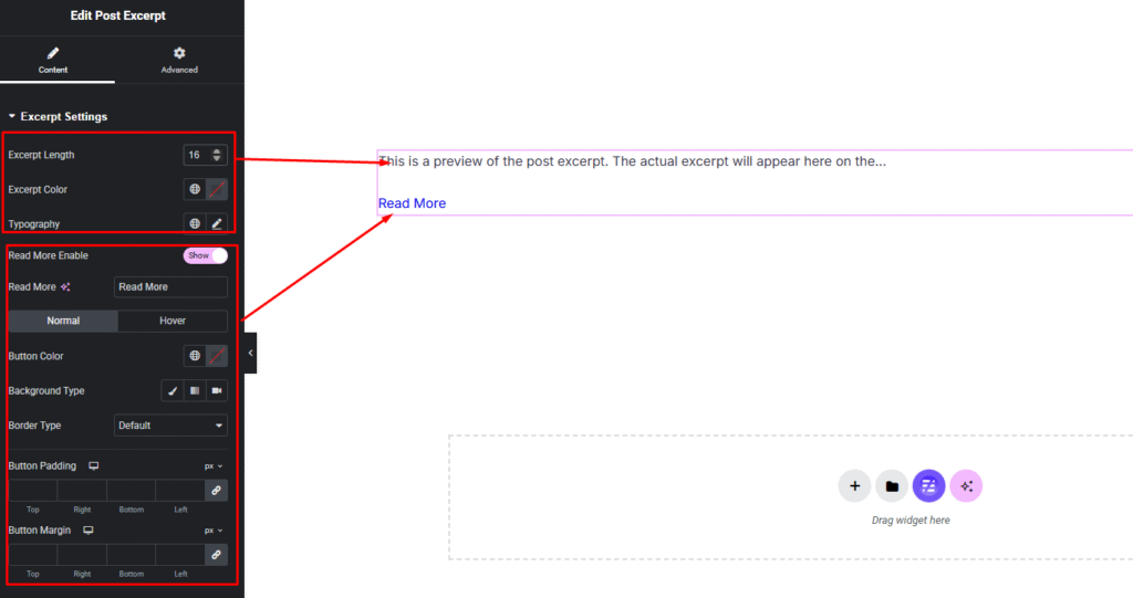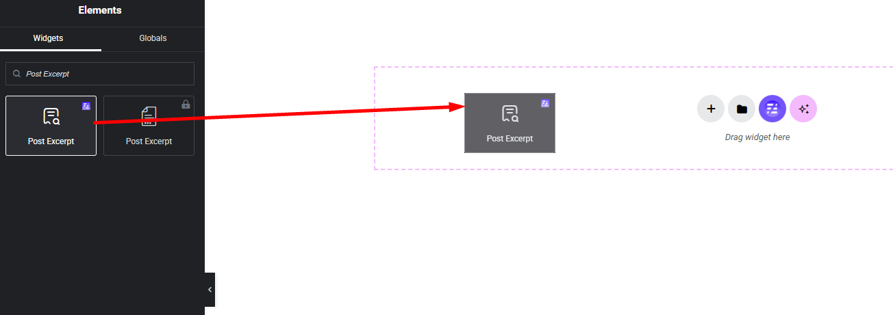 Select the Post Excerpt widget from the left panel, then drag and drop it into your desired area on the canvas.