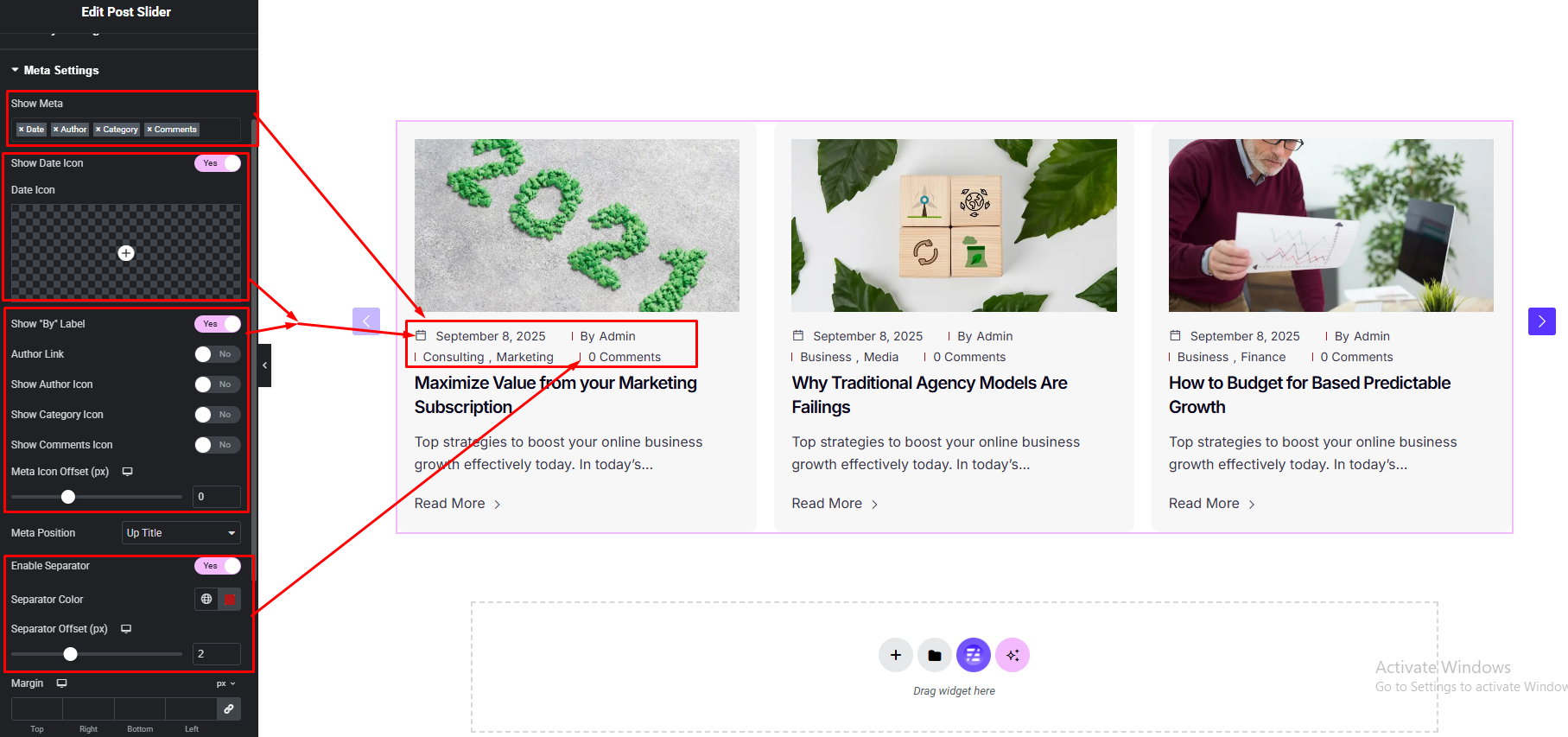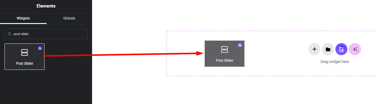 Select the Post Slider widget from the left panel, then drag and drop it into your desired area on the canvas.