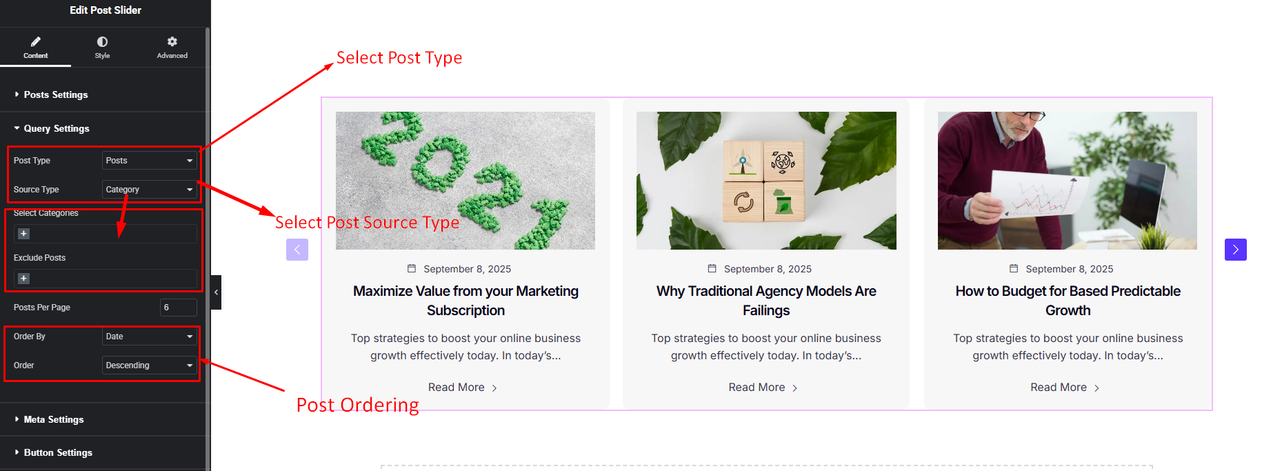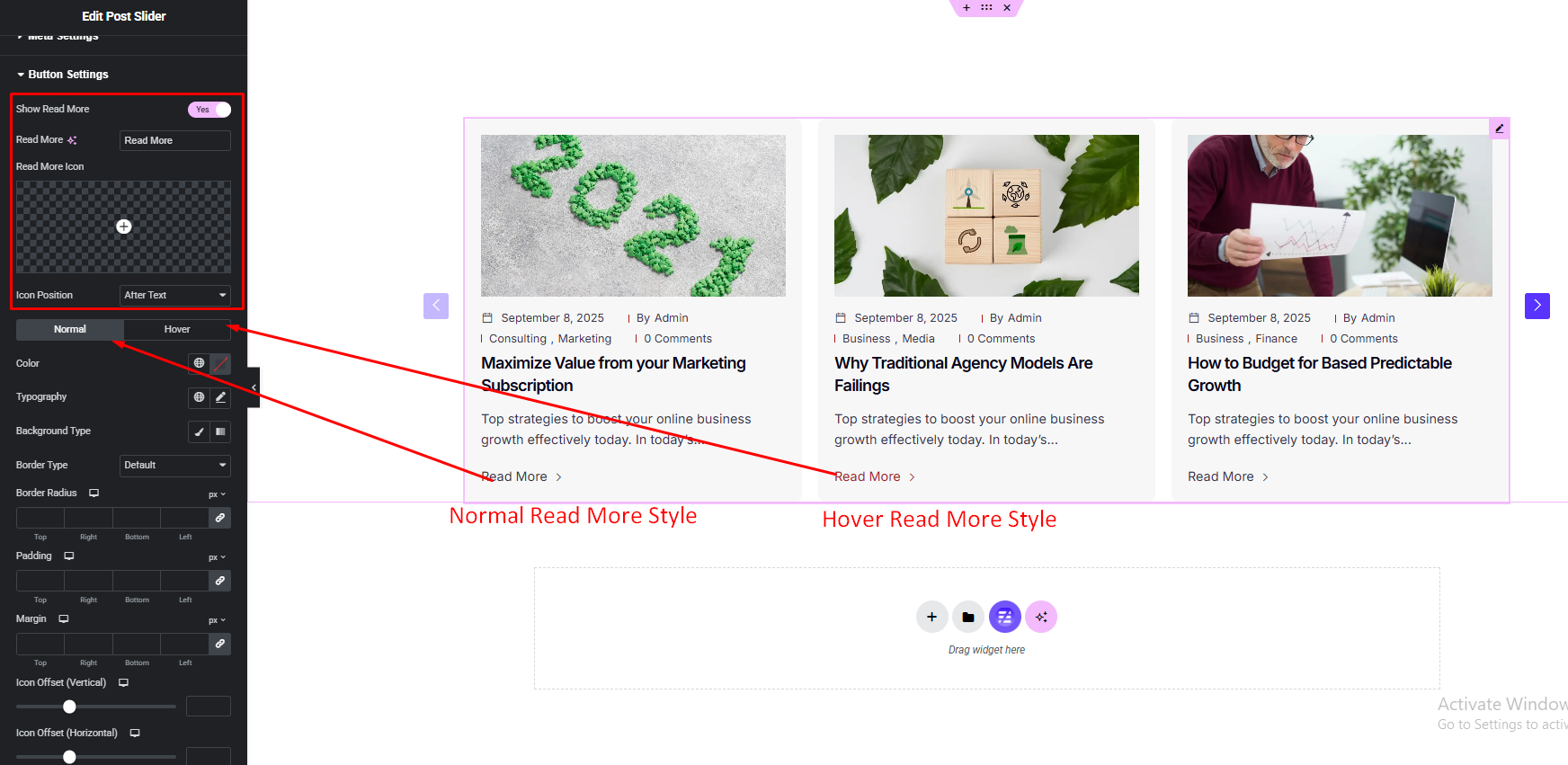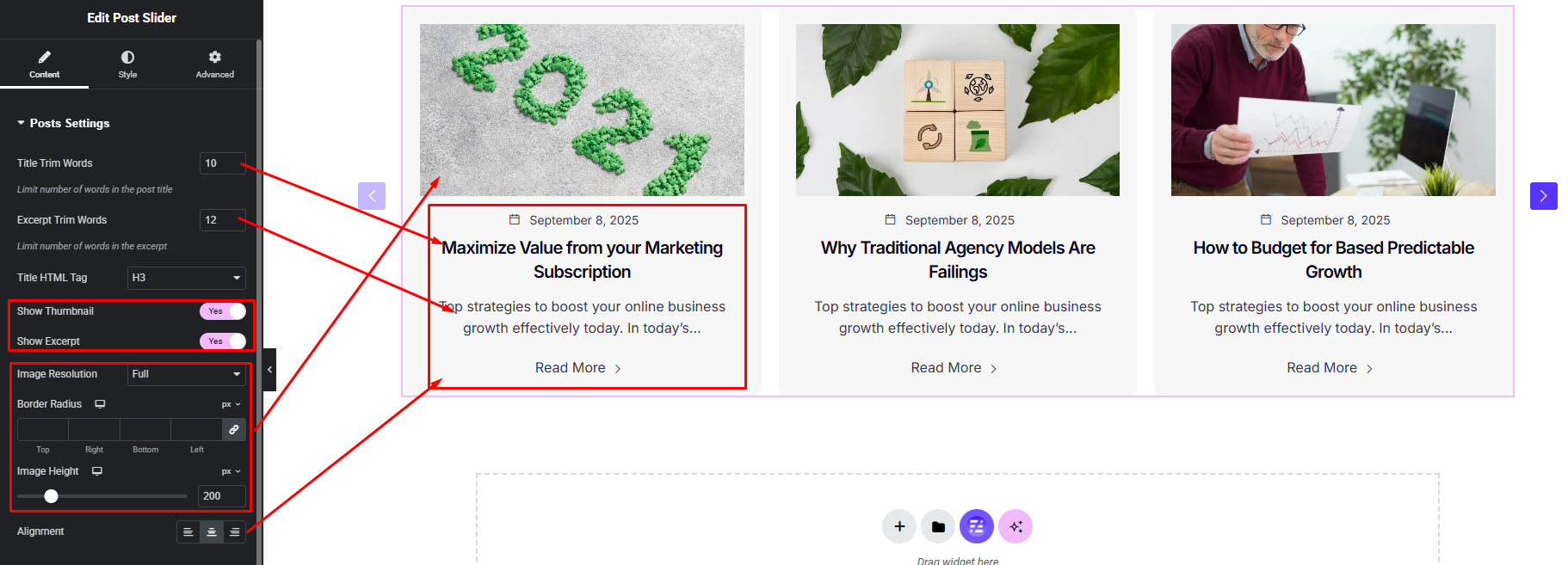 Easily customize your widgets appearance including Post Slider item, content part, title, excerpt, meta info and more style — all from the Style panel.