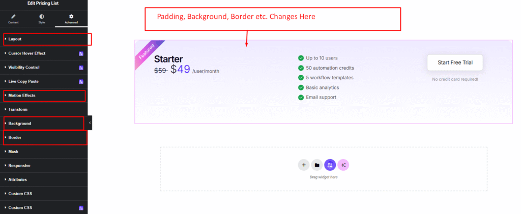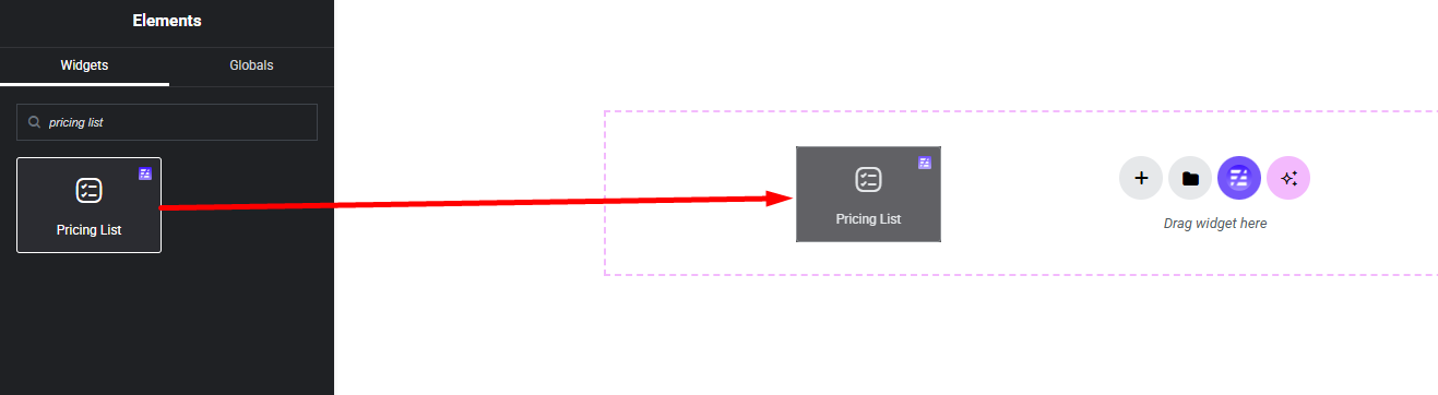 Select the Pricing List widget from the left panel, then drag and drop it into your desired area on the canvas.