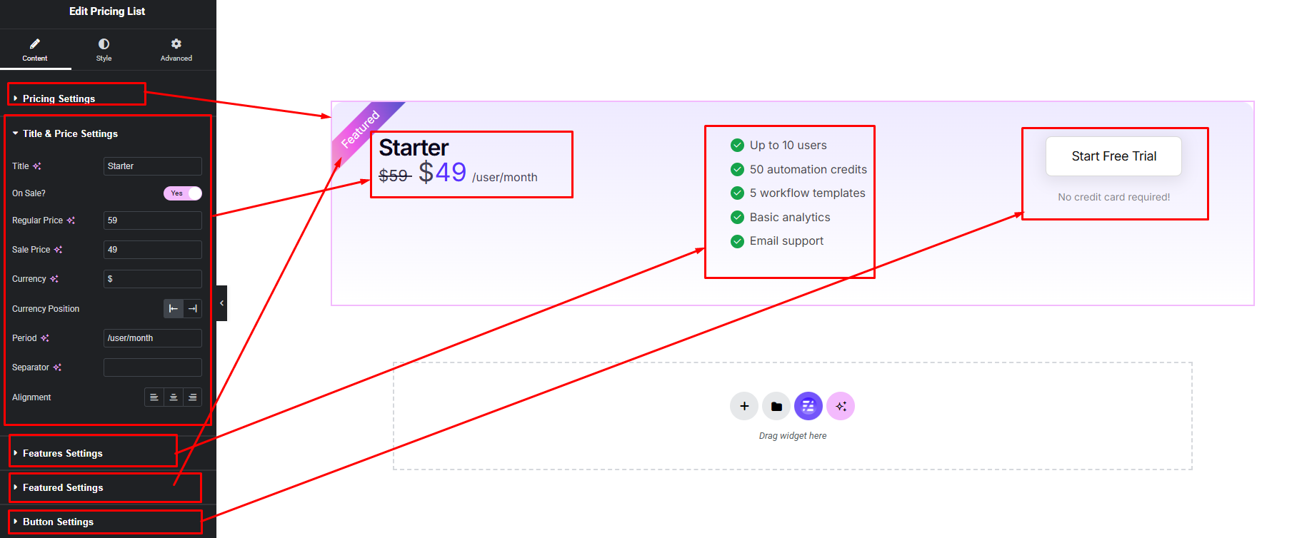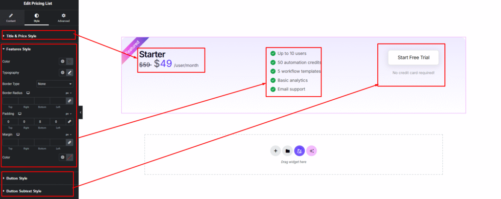 Easily customize your widget’s appearance including pricing list title, description, price, features and button — all from the Style panel.
