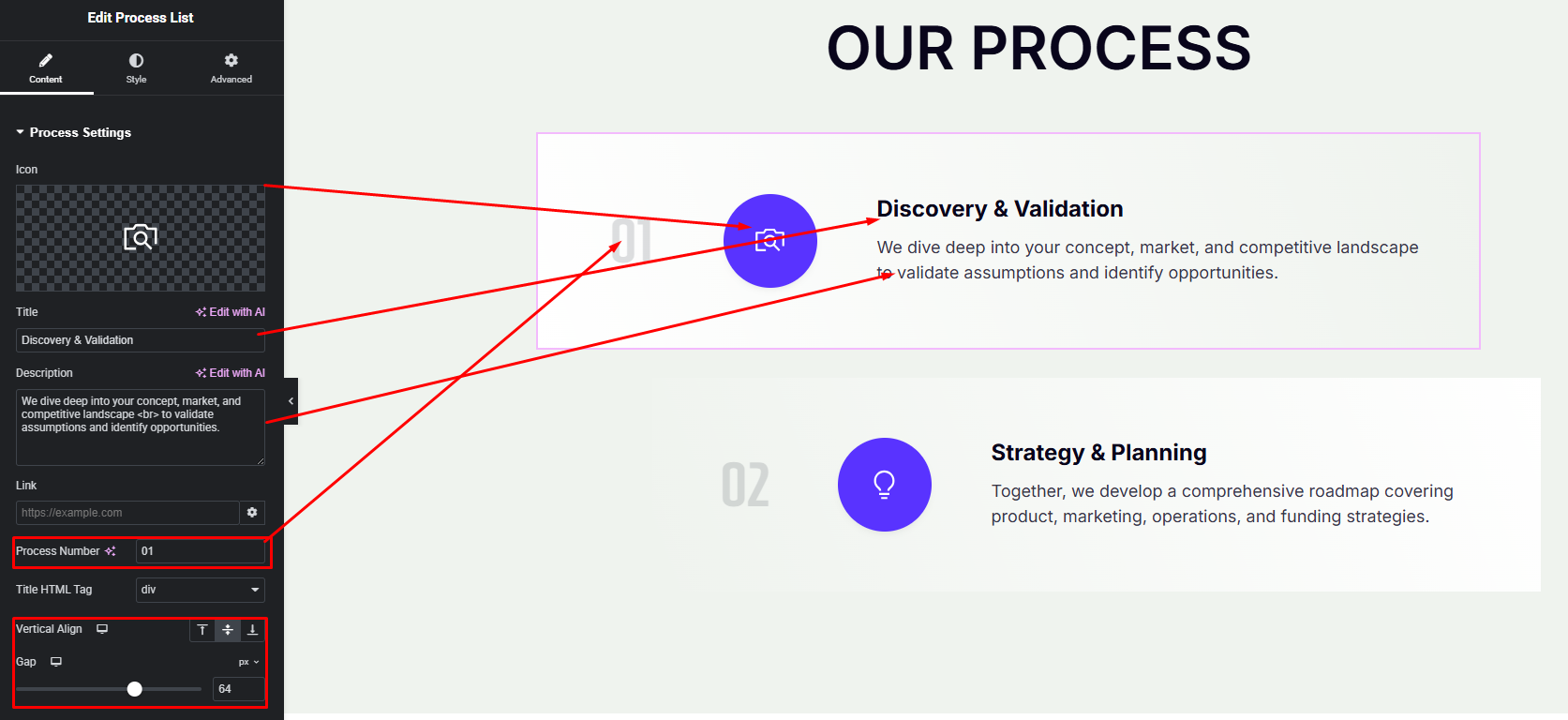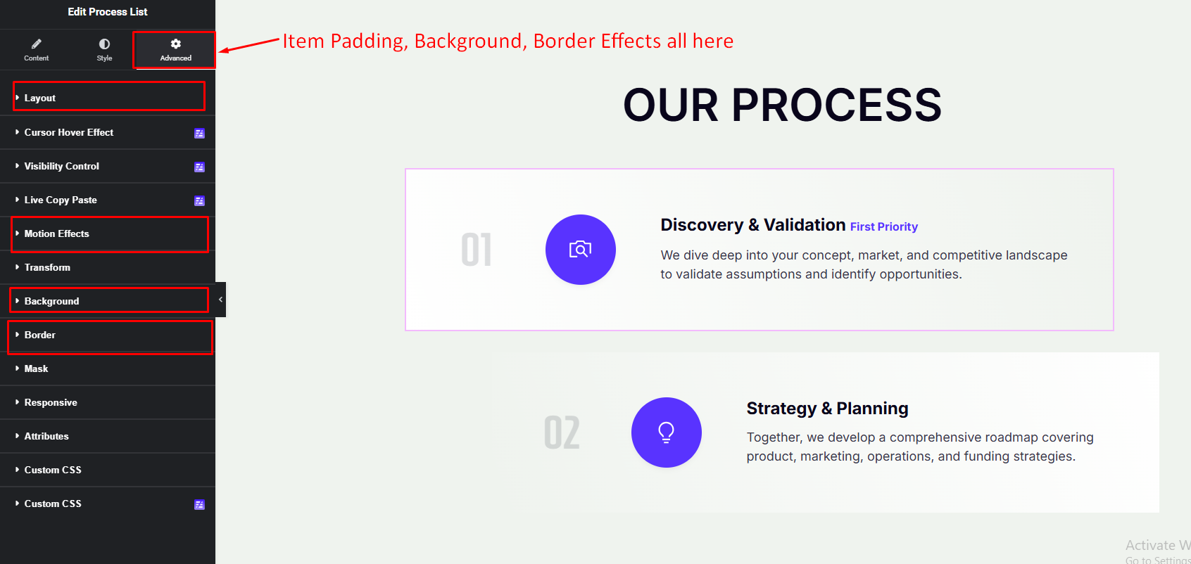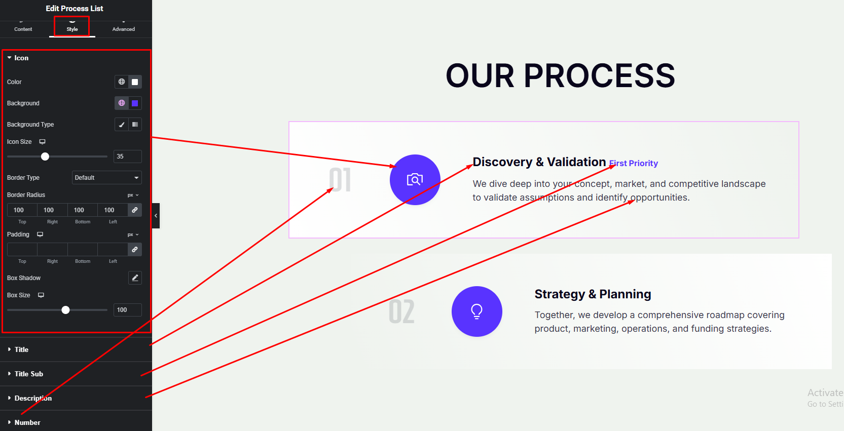 Easily customize your widgets appearance including Process List item, icon, title, description and more style — all from the Style and Advance panel.