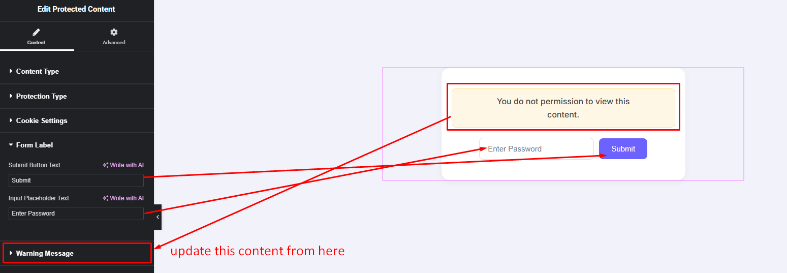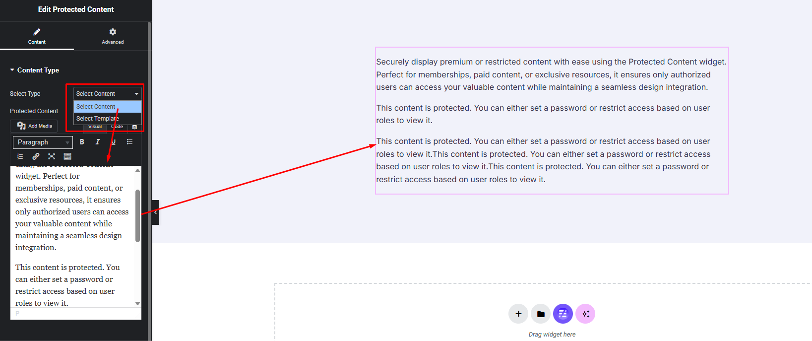 Select the Protected Content widget from the left panel, then drag and drop it into your desired area on the canvas.