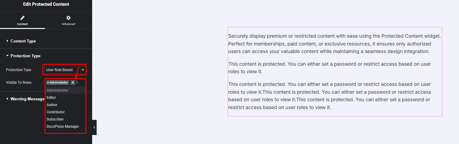Restrict content visibility based on specific user roles. Only users with the selected roles will be able to access the protected content. (ex role: Administrator, Author, Editor etc.)