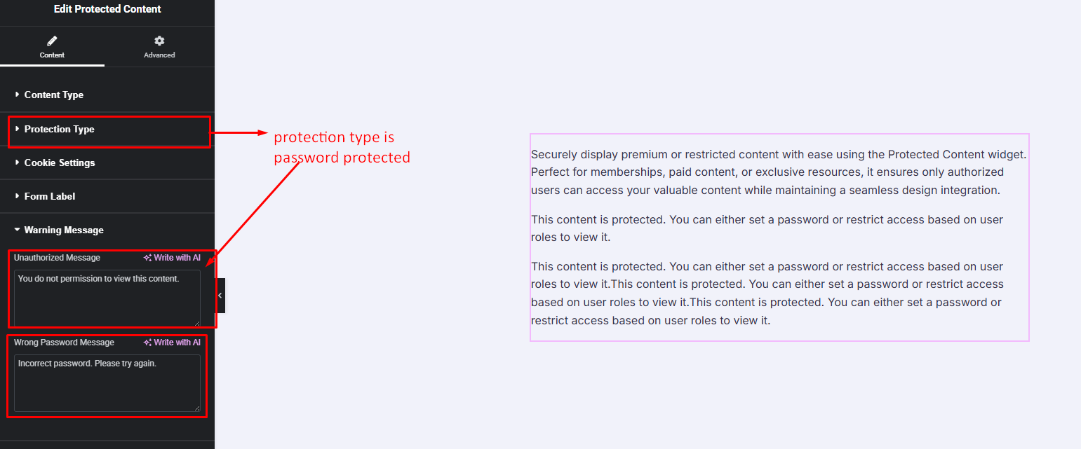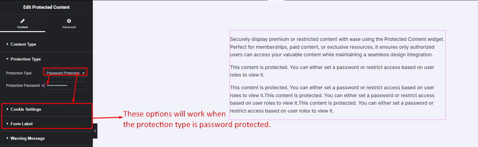 The Protected Content widget allows you to hide specific sections of your page and make them accessible only to selected users. You can restrict content by password, user role, or login status, ensuring only the right audience can view your protected information.