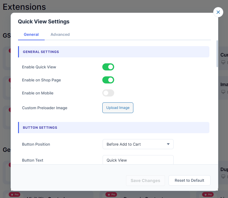 - 1.2 – Enable on Shop PageShows or hides Quick View button on the Shop page.