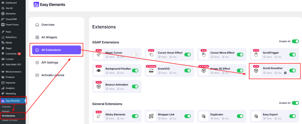Go to Easy Elements → All Extensions → GSAP Extension → Scroll Smoother