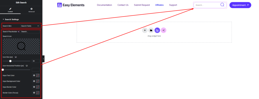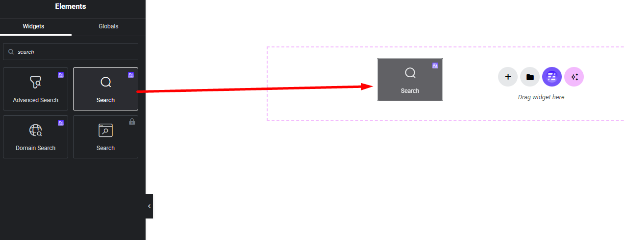 Select the Search widget from the left panel, then drag and drop it into your desired area on the canvas.