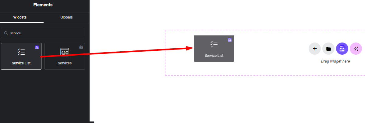 Select the Service List widget from the left panel, then drag and drop it into your desired area on the canvas.