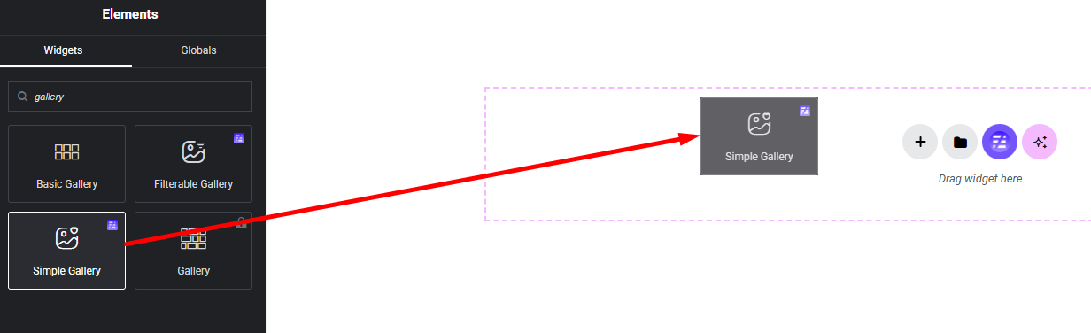 Select the Simple Gallery widget from the left panel, then drag and drop it into your desired area on the canvas.