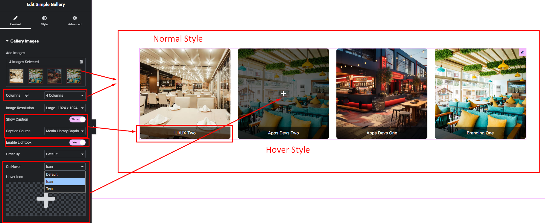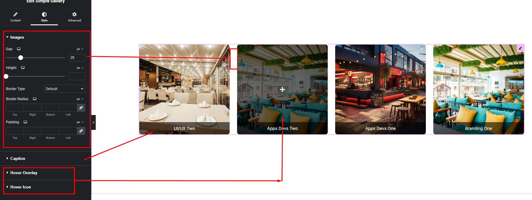 Easily customize your widget’s appearance including gallery item, caption, hover overlay bg and hover icon or text style —all from the Style panel.