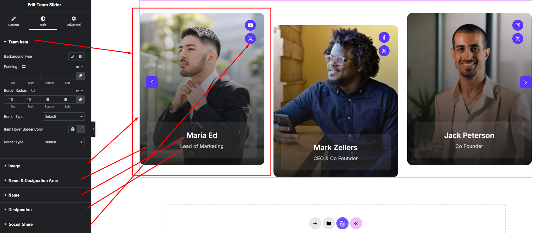 Easily customize your widget’s appearance including Team Slider item background, border, padding etc. & Team Name, Designation and more —all from the Style panel.