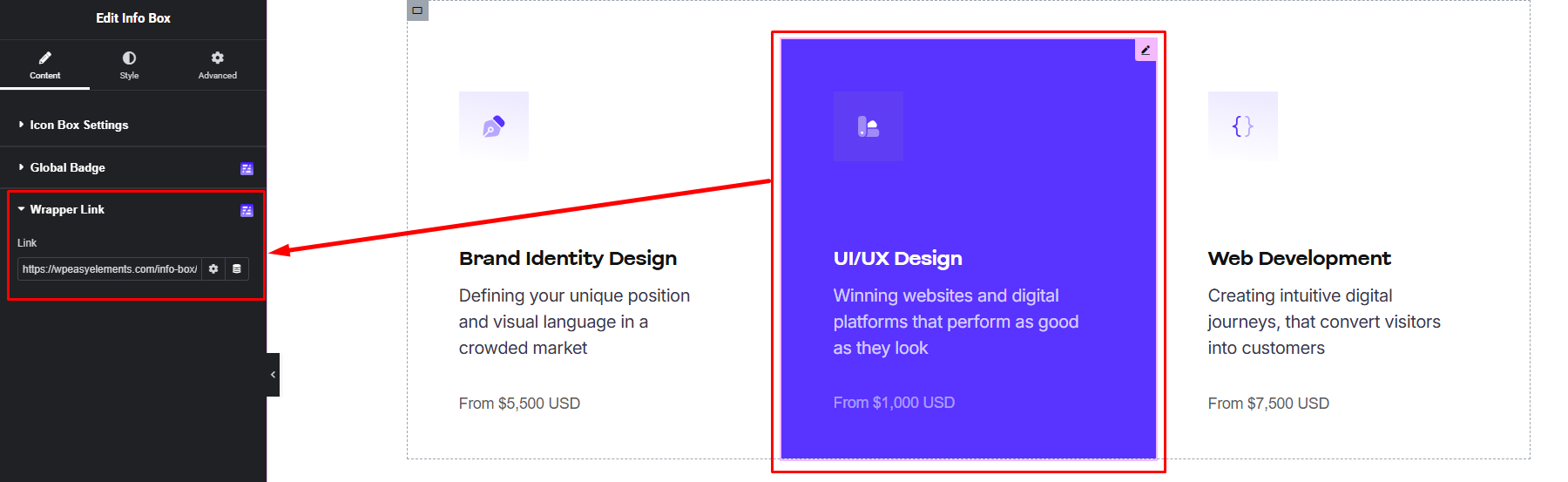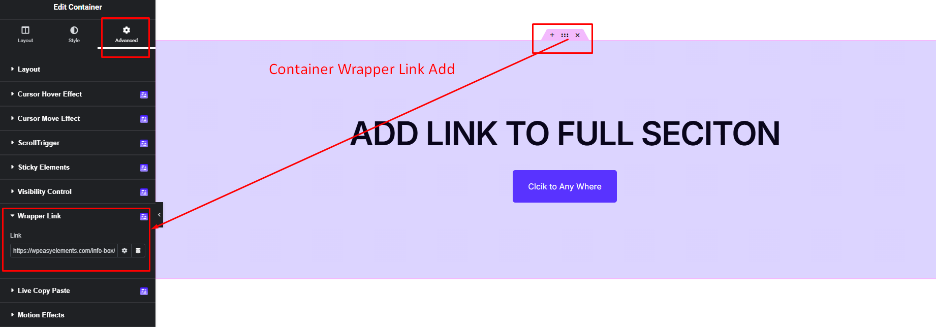 2. Container and Section add wrapper link under advanced tab and other widget items add wrapper link under content tab.